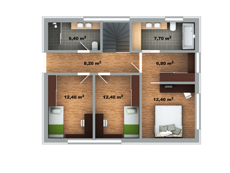 V prvním nadzemním poschodí jsou na západ od schodiště situovány dva prostorné dětské pokoje s komfortní koupelnou s velkým sprchovým koutem, který mohou využívat i rodiče. Část vyhrazená rodičům vytváří uzavřený svět sám pro sebe tak, aby měli rodiče maximální soukromí a pohodlí. Do ložnice se vstupuje přes prostorný šatník, který je spojený s vlastní koupelnou rodičů. Ta je na rozdíl od koupelny pro děti vybavena vanou pro chvíle relaxu. Prostor ložnice je také vybaven malým pracovním koutem.