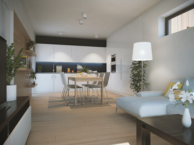 Zde je také jídelna připravená poskytnout plný komfort všem strávníkům v domě, takže i maminka může hostit všechny členy najednou. Část obývacího pokoje věnovaná pohodlnému sezení před televizí je ale výrazně větší, aby dokázala sloužit většímu počtu lidí v domácnosti. Tato místnost je orientovaná na jih, stejně tak jako obývací pokoj prarodičů, je však v půdorysu uskočena, takže nevzniká žádné optické spojení mezi těmito místnostmi a zároveň i celá jižní terasa bytu 4+KK je obyvatelům bytu 2+KK neviditelná. Toto platí i naopak. Jednu věc však mají tyto dva byty společnou. Tou je technická místnost. Nachází se vedle zádveří a je dimenzovaná tak, aby mohla obsáhnout vybavení potřebné na provoz obou domácností.
