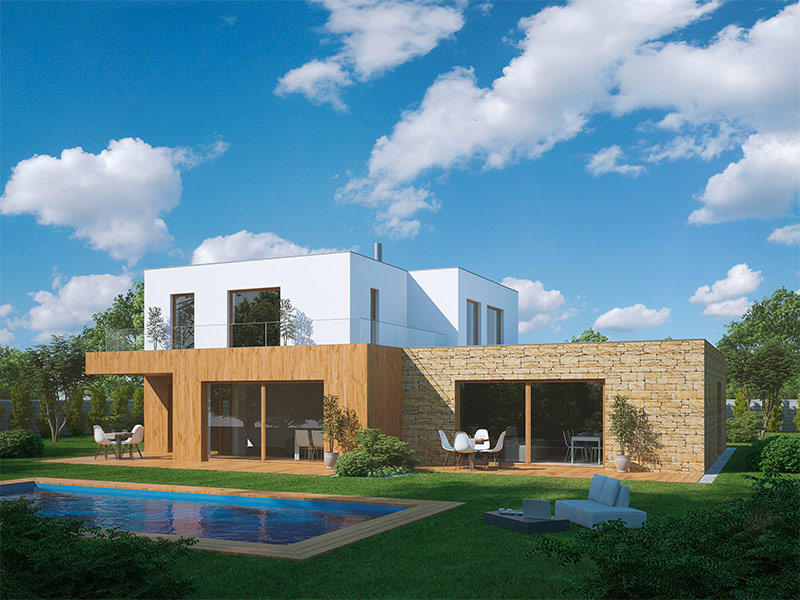 Hlavní část domu je rozdělena na dvě zóny podle pater. Spodní společenská zóna s technickým zázemím a garáží a vrchní soukromá s ložnicemi a koupelnami. Opět přicházíme z krytého závětří přes vstupní halu, kde se nachází technická místnost, schodiště a wc. Obývací pokoj s kuchyní a jídelnou je velkoryse řešen s velkým množstvím francouzských oken. Velký jídelní stůl je základem pro společné setkávání všech generací. Krytá terasa umístěná naproti kucjyně poskytuje nerušené soukromí. Důležitým prvkem dispozic je umístění ložnic a dětských pokojů pouze nad část jedné generace, vzhledem k rozdílným rytmům a harmonagramu dne. Ložnice v soukromé části domu je vybvena prostornou šatnou, výhledem do zahrady, soukromou terasou a koupelnou.