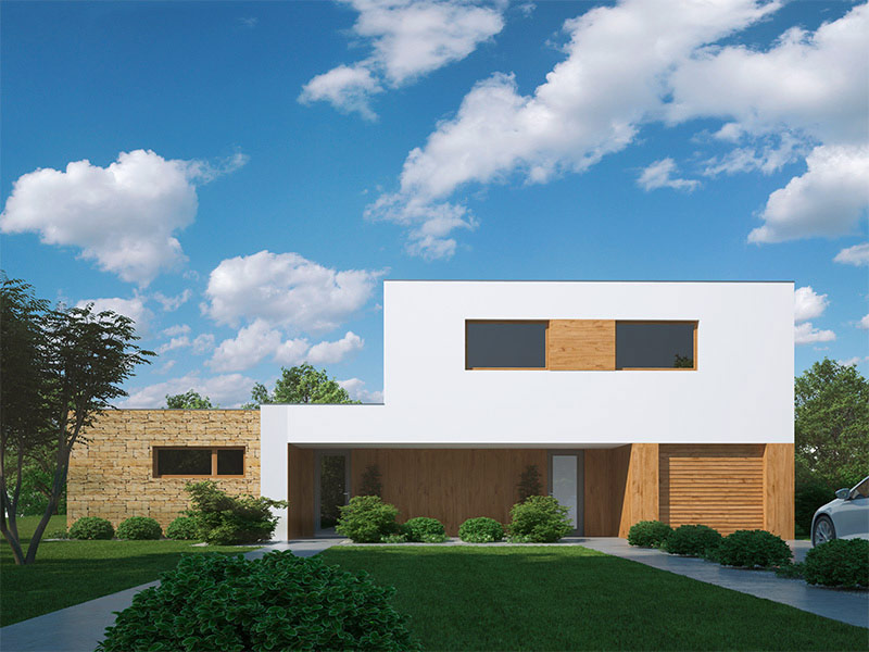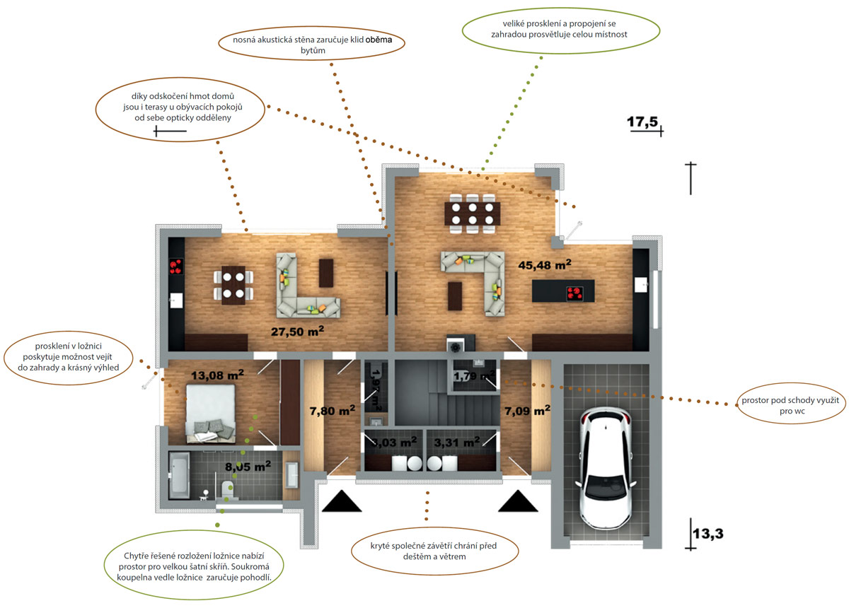 Dvojdům je řešen jako členitý objekt, který v sobě skrývá dvě bytové jednotky. Jeho dobrá členitost napomáhá správnému fungovaní obou jednotek. Každá má svůj vstup, své zázemí a část zahrady. Předsunutím obývacího pokoje většího bytu se vytvořilo kryté zákoutí terasy pro ten menší. Oddělené dispozice poskytují dostatek soukromí, ale zároveň umožňují užít si vzájemnou společnost, kdy je potřeba.