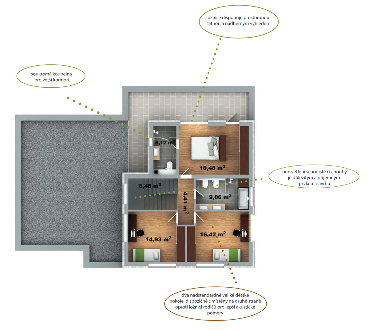Byt 2+kk , který je převážně využíván starší generací díky své bezbariérovosti a menší náročnosti na údržbu, nabízí vše potřebné pro pohodlný život ve dvou, či osamotě. Kryté závětří navazuje na prostornou předsíň s dostatkem úložných prostor, ze které se dostaneme do technické místnosti a wc. Z předsíně vstupujeme přímo do velkého obývacího pokoje s kuchyní a jídelním stolem, bohatě prosluněného velkými francouzskými okny směrem do zahrady. Z obývacího pokoje se dostaneme pohodlně do ložnice se soukromou koupelnou. Toto řešení snižuje zbytečné plochy chodeb a dveří.