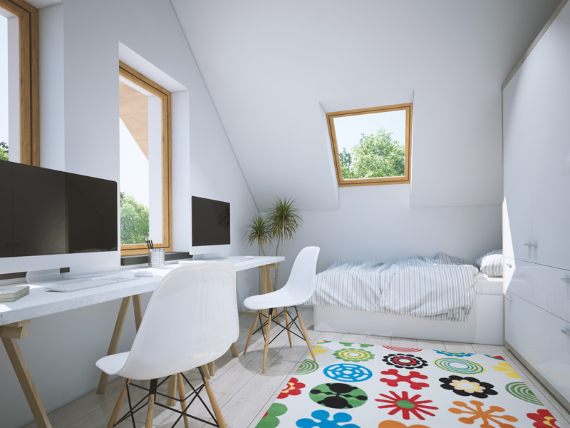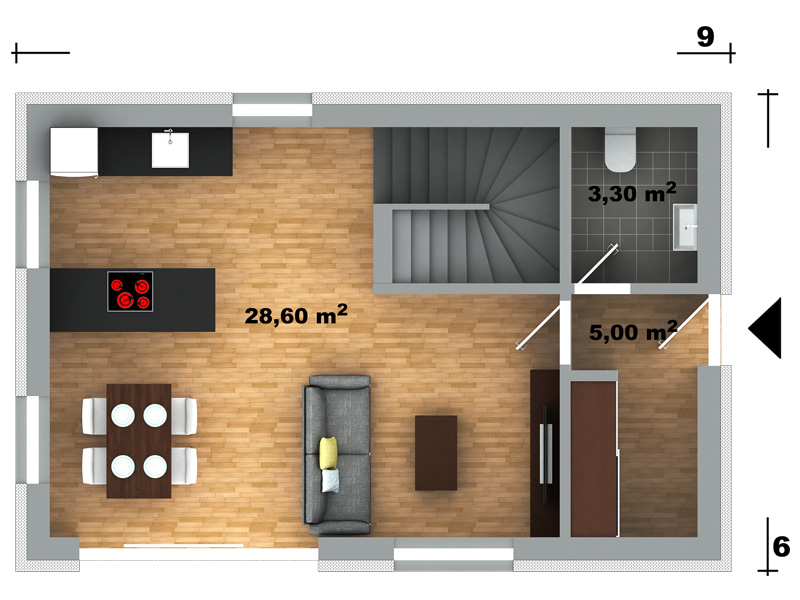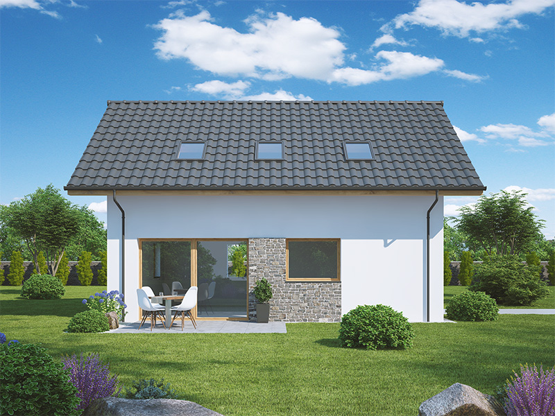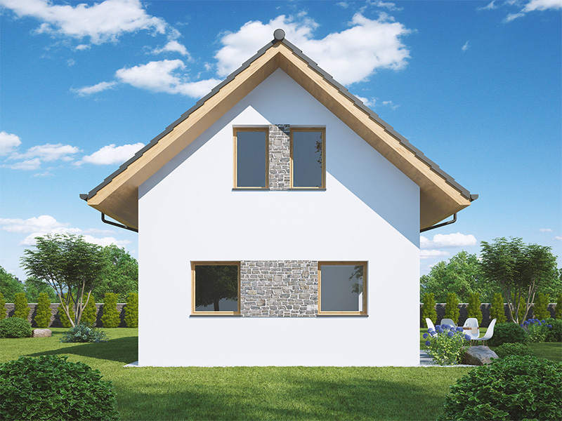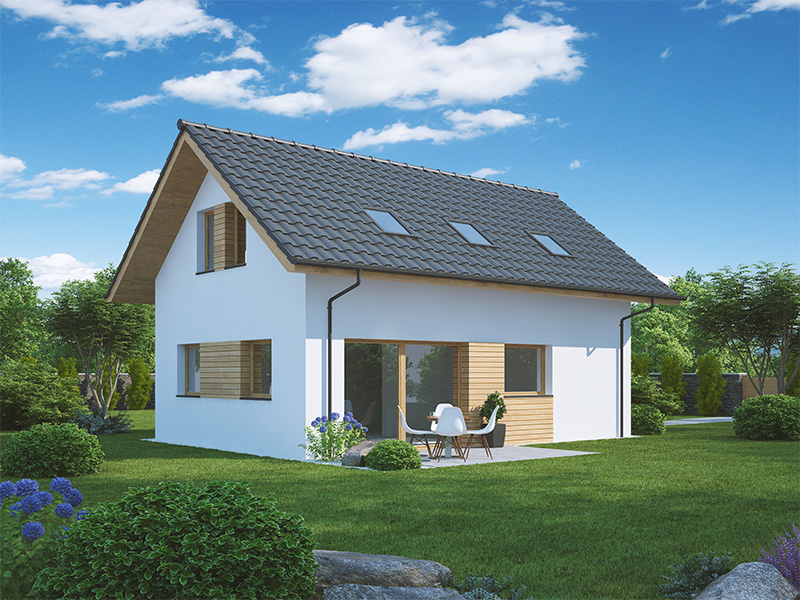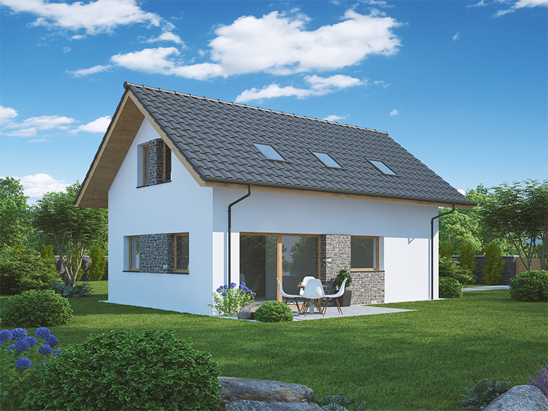 Přízemí domu využívá veškerý prostor pro denní režim. Kuchyňský kout je opticky propojený s obývacím pokojem. Nalezneme zde i samostatné WC přístupné ze vstupní chodby. V podkroví domu jsou pak umístěny obytné pokoje a společná koupelna.