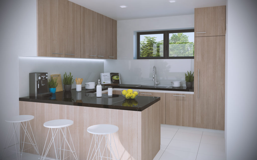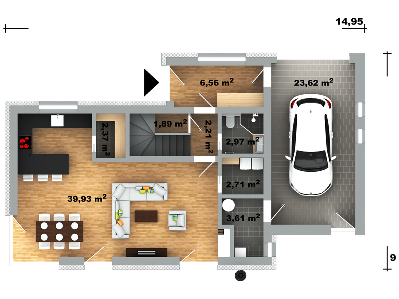 Dispozice je chytře řešena s dostatkem úložných prostor. V přízemí je velký obytný prostor s kuchyňským koutem, který je opticky oddělen od hlavního dění, ale zároveň neztrácí kontakt s obývacím pokojem. Dále jistě potěší i samostatná technická místnost a vstup garáže přímo do zádveří domu.
