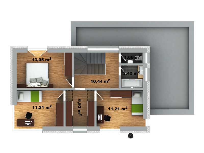 V patře je umístěna ložnice a dva dětské pokoje, které jsou propojeny místností, která lze využívat jako šatna, herna, nebo třeba pracovna. Na to vše je uzpůsobena. Samozřejmostí je pak koupelna a samostatné WC. Dům Dominik 35 lze navíc pořídit s rozdílnými řešeními fasády, a hlavně jeho provedení s různě orientovaným celoplošným cihelným obkladem a betonovou stěrkou umístěnou na hmotě garáže dodává domu nádech elegance a moderny.