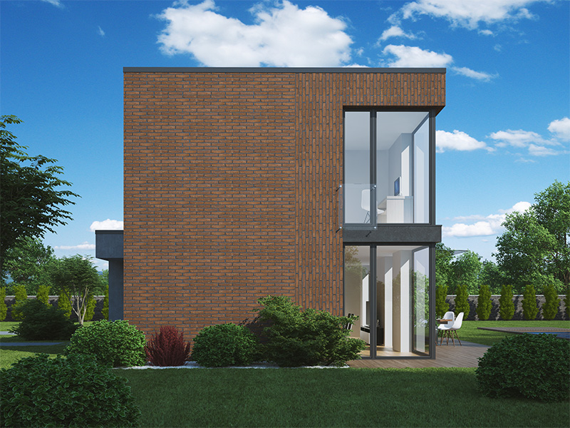 Dominantním prvkem vzhledu je velké prosklené nároží, které dodává nejen dostatek světla do obývacího pokoje a pokoje nad ním, ale zároveň umožňuje i velkorysý výhled z interiéru do exteriéru.
