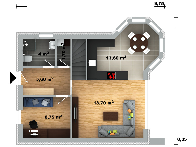 Prostorné zádveří s dostatkem úložného prostoru, umožňuje vstup do koupelny se sprchovým koutem a toaletou, technické místnosti a pracovny, kterou je možné v případě potřeby využít jako ložnici či pokoj pro hosty. Zbytek přízemí tvoří obývací pokoj s kuchyňským koutem ve tvaru písmene U a jídelní stůl příhodně umístěný v apsidě.