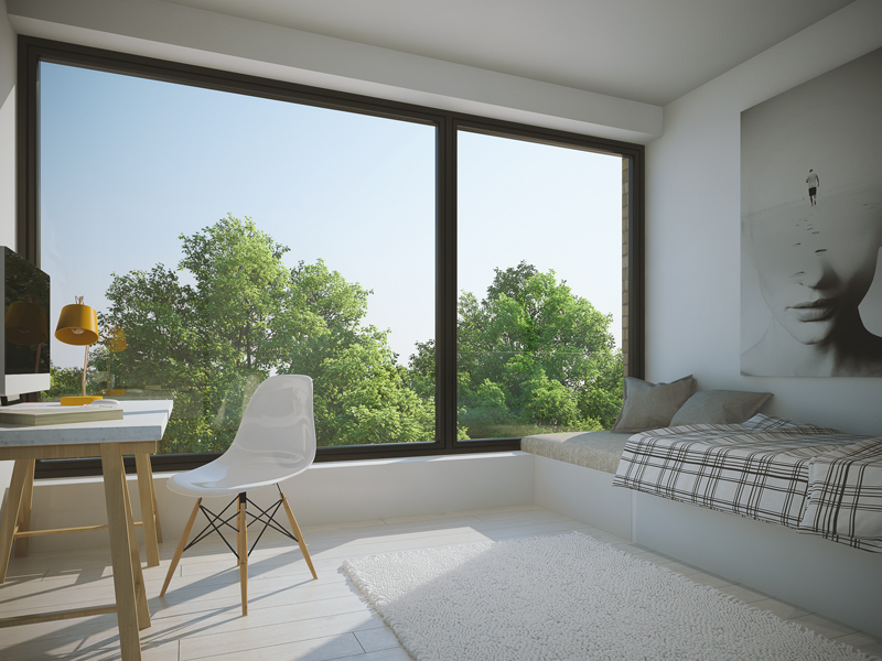 V patře jsou navrženy velké dětské pokoje, kde bylo zásadním požadavkem jejich skvělé přirozené osvětlení. Výsledkem je, že namísto často podkrovních tmavších pokojů patří v tomto domě dětem dva nejhezčí pokoje s úžasným výhledem ven.