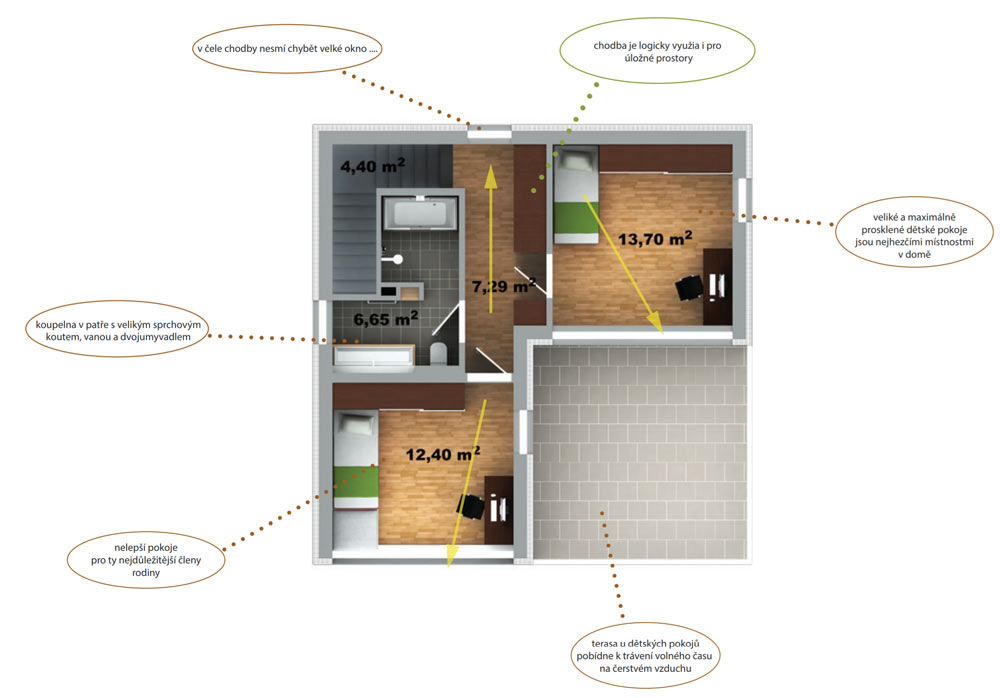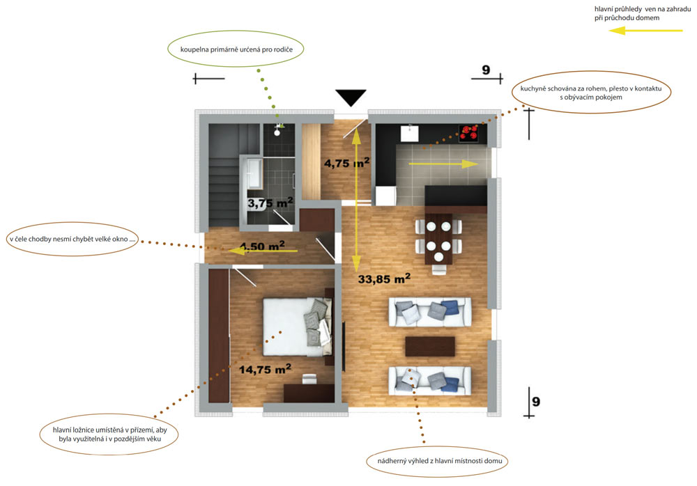 Obývací pokoj je propojen s jídelnou a od vstupu šikovně schovanou kuchyní. Celý tento prostor je doplňkově osluněn i menšími bočními okny. Spodní patro je dále určeno pro rodiče a jejich ložnici, první koupelnu s toaletou a chodbou vedoucí ke schodišti do druhého podlaží.